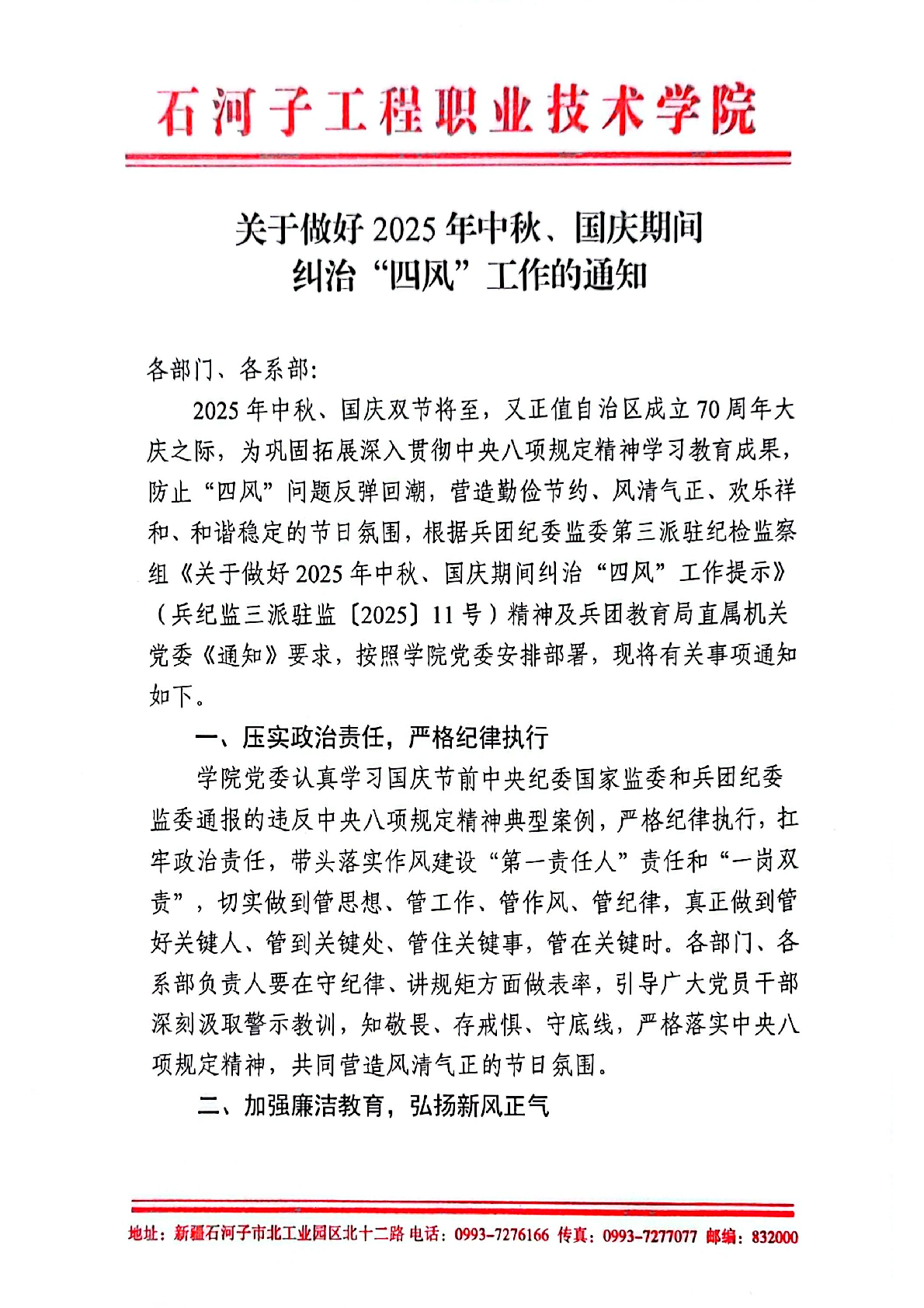 关于做好2025年中秋、国庆期间 纠治“四风”工作的通知